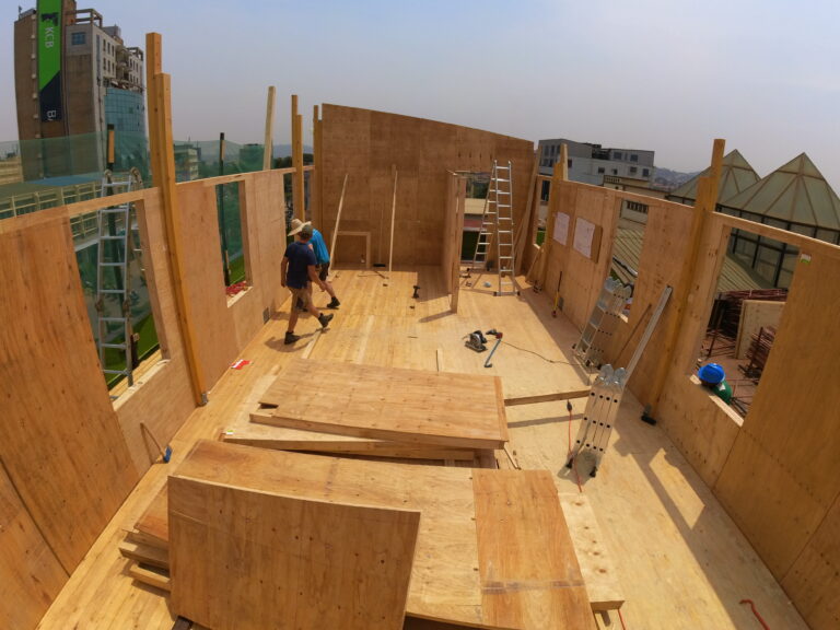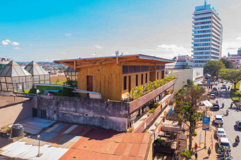 Los éxitos y el reconocimiento público que Fairventures en el mundo (con sede en Stuttgart) a través de sus programas de reforestación en Borneo han animado a la organización a iniciar también la reforestación de antiguos bosques primigenios destruidos en Uganda. La intención de Fairventures Worldwide (FVW) es combinar la reforestación con enfoques tecnológicos para revitalizar zonas degradadas de Uganda de forma ecológica y socialmente sostenible. En colaboración con los agricultores locales, se cultivan especies arbóreas autóctonas de crecimiento rápido. Estas especies mejoran la biodiversidad, contribuyen al secuestro de CO2 y crean perspectivas de ingresos a largo plazo para la población local. El proceso abarca toda la cadena de valor de la madera, desde la plantación hasta la utilización estructural. La atención se centra en su transformación en productos de madera modernos, como la madera laminada encolada y la madera contralaminada. El uso de estos materiales fomenta la construcción sostenible con madera y reduce la dependencia de otros materiales de construcción más perjudiciales para el clima, como el hormigón y el acero. Con su suelo fértil y su clima favorable, Uganda ofrece condiciones ideales para la reforestación. Al mismo tiempo, la incertidumbre política y las talas ilegales ponen en peligro los ecosistemas forestales. Por ello, el gobierno planea reforestar dos millones de hectáreas de aquí a 2030. El proyecto apoya este empeño promoviendo la construcción con madera de origen local y eficiente en el uso de los recursos. Un proyecto central es el Centro de Innovación de la Madera de Kampala. Como escaparate y centro administrativo de esta iniciativa, se construyó una estructura abuhardillada en construcción de madera para demostrar visiblemente el potencial de esta madera en el sector de la construcción. En colaboración con arquitectos alemanes, la Universidad de Ciencias Aplicadas de Berna y socios locales, se creó un centro de intercambio de conocimientos con el objetivo de reforzar la experiencia local en la construcción en madera. El centro ofrece cursos de formación, seminarios y sirve de objeto de demostración para la arquitectura sostenible. Está situado en la azotea de un edificio de tres plantas existente en el centro de la ciudad de Kampala y se construyó íntegramente con madera de producción local. Como signo visible de una construcción orientada al futuro, contribuye a la aceptación social de la construcción moderna en madera en África Oriental.