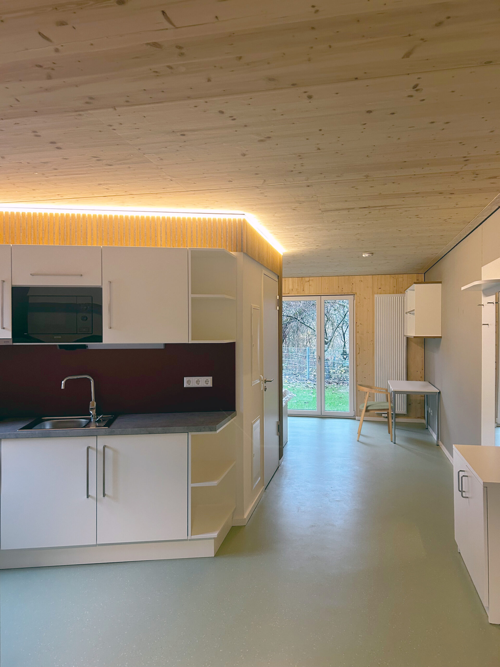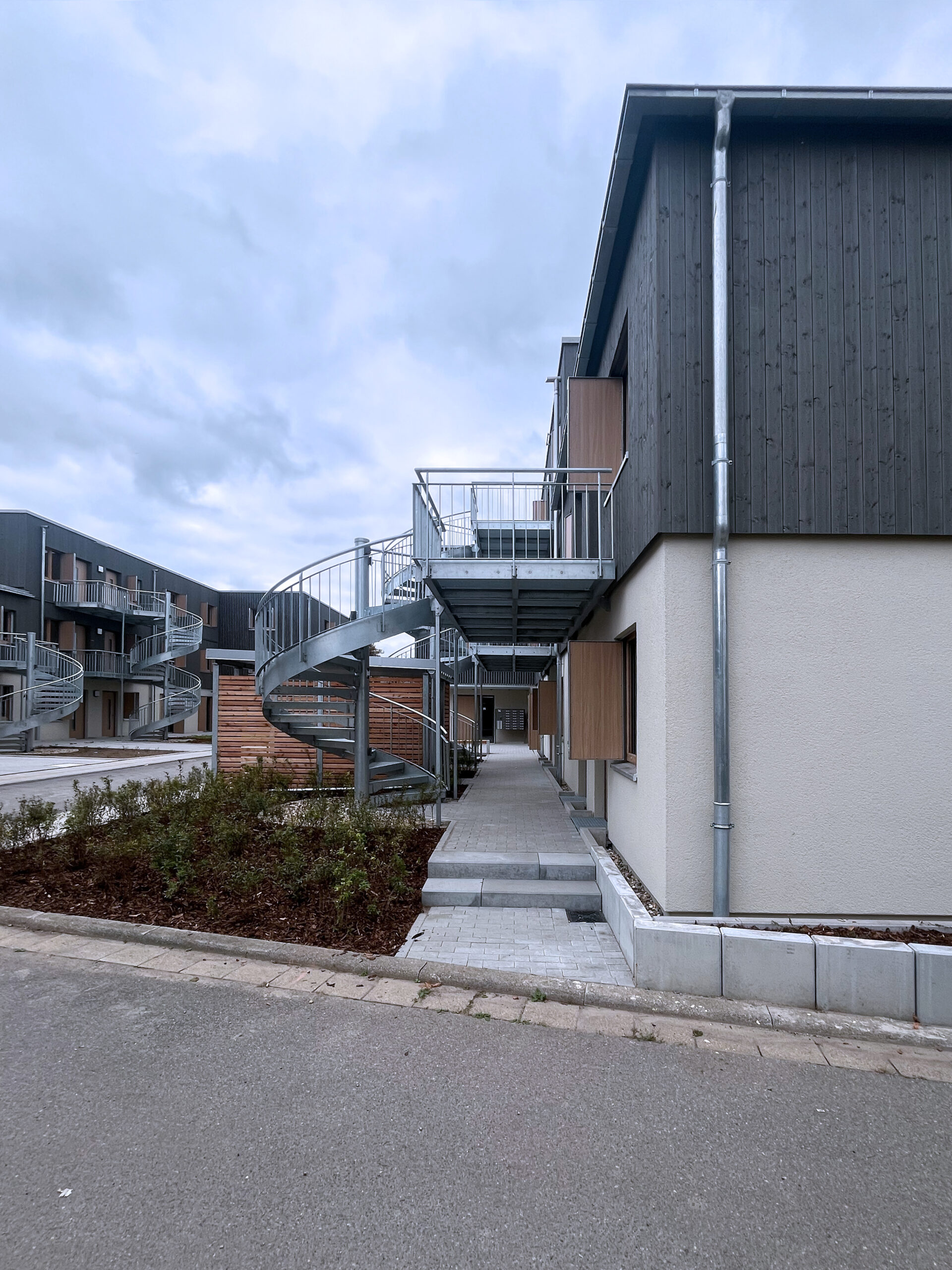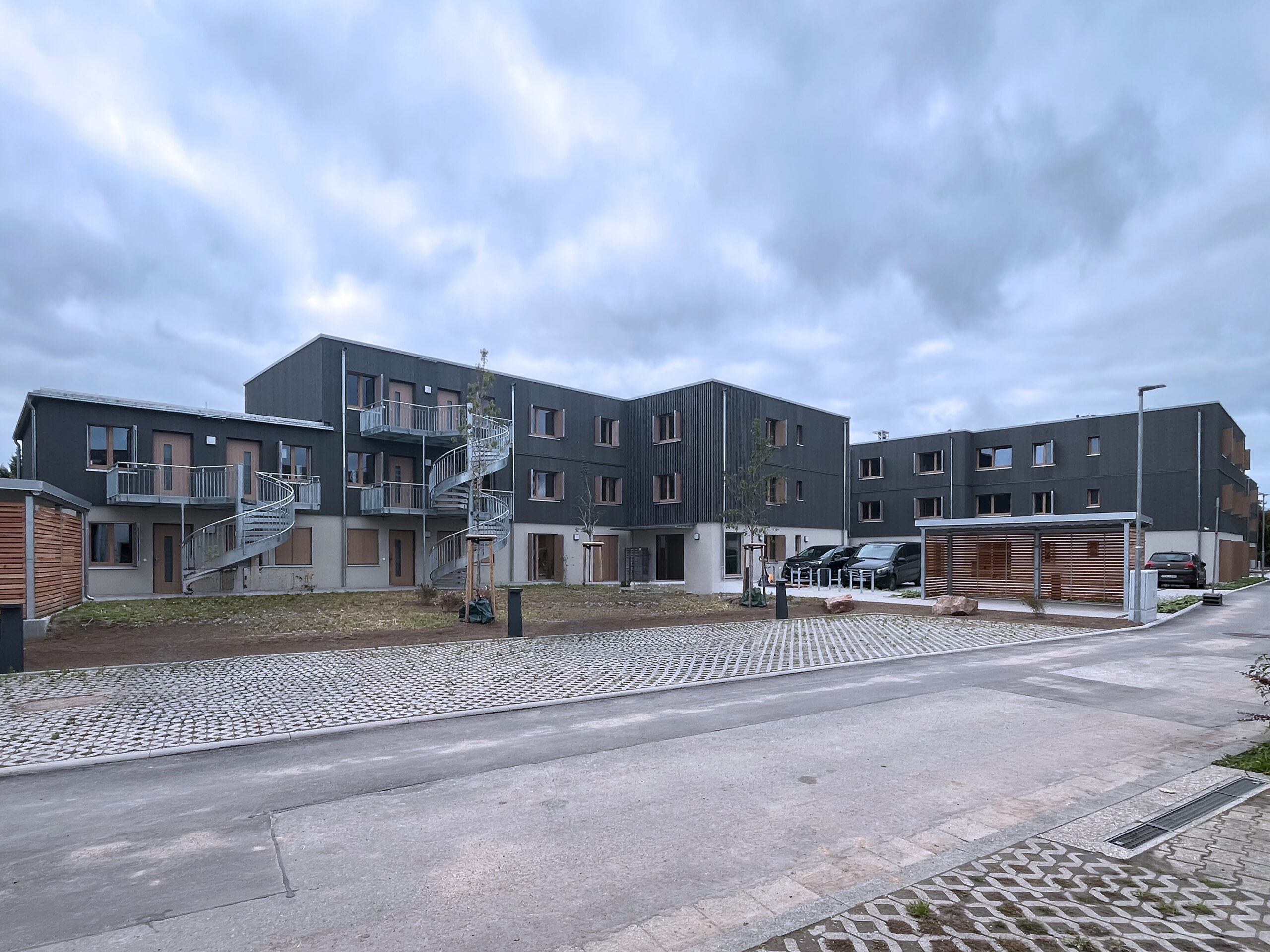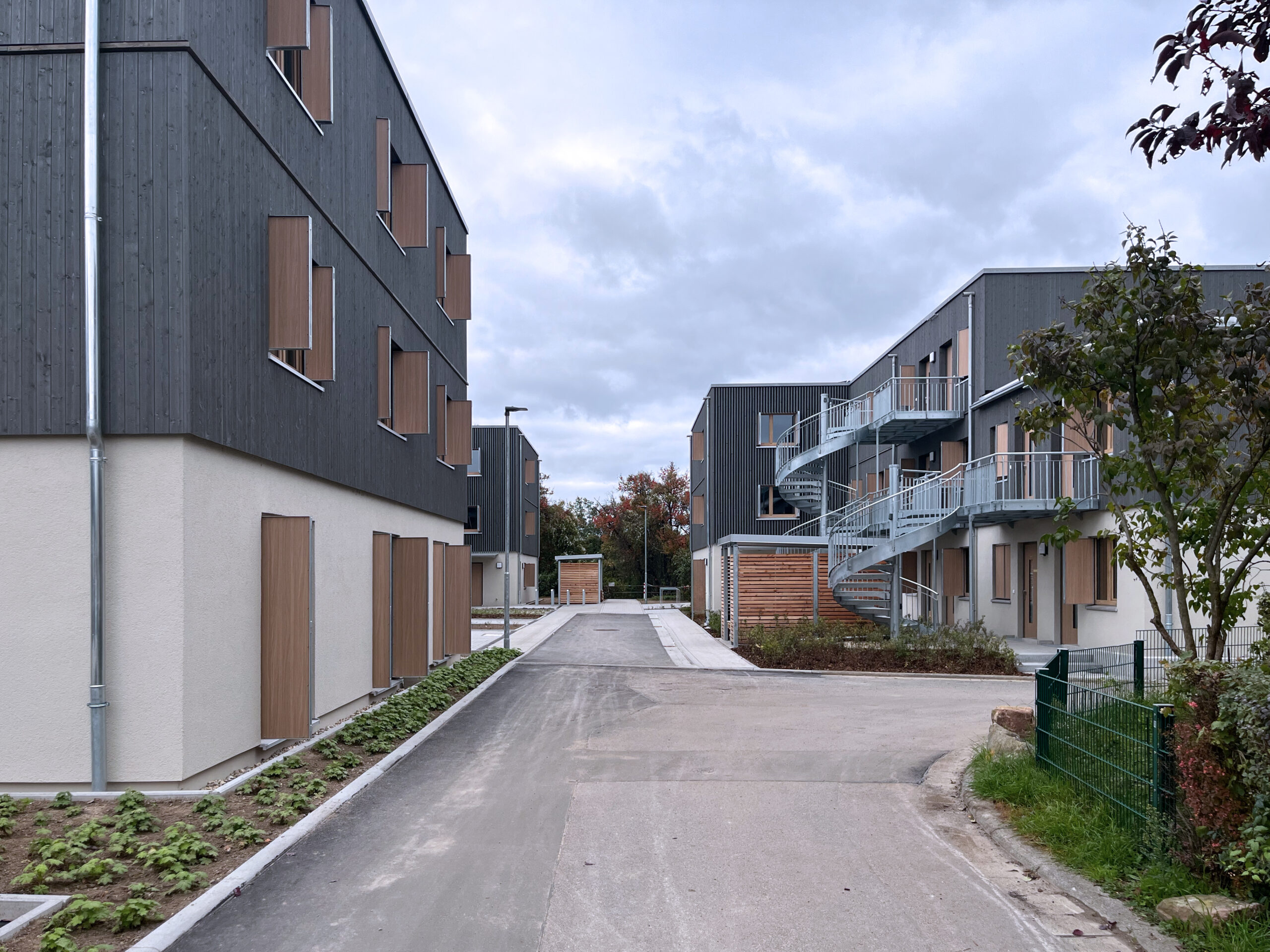 Das Wohnheim, bestehend aus 5 einzelnen Häusern, fügt sich die Umgebungsbebauung in Größe und Körnung ein. Jedes Haus besteht aus einem Kopfbau, der bei jedem Haus identisch ist, und einem unterschiedlich langen Längsbau. Durch eine geschickte Anordnung der Gebäude bilden sich Innenhöfe aus, die der Erschließung als auch der Privatsphäre dienen. Darüber hinaus fördern diese die zufälligen Begegnungen der Bewohner:innen und stärken das Zugehörigkeitsgefühl.
